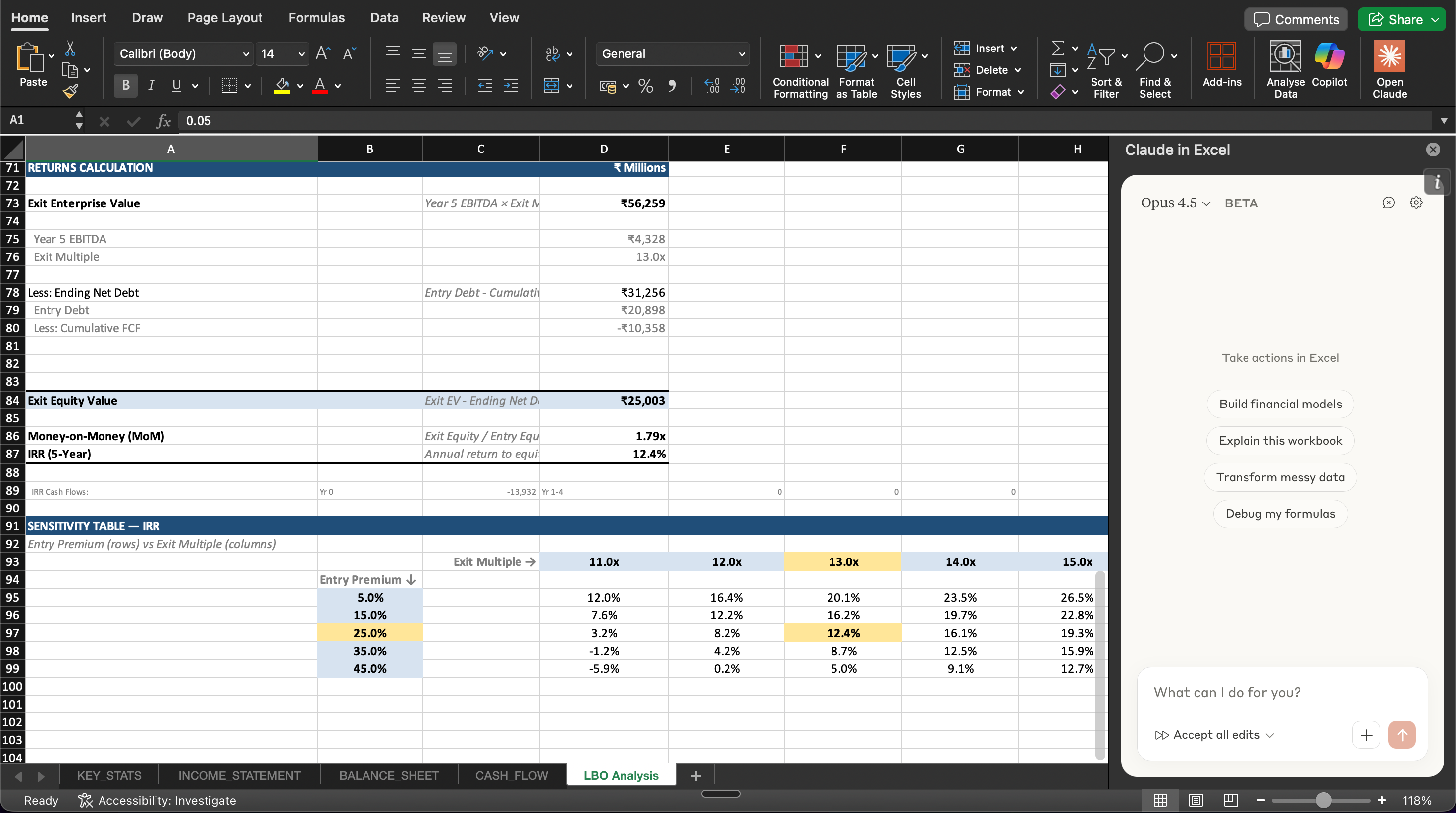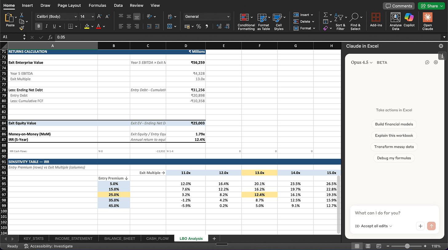 This prompt builds a 5×5 sensitivity grid around two things that actually determine whether a PE deal works: exit multiple and entry premium.