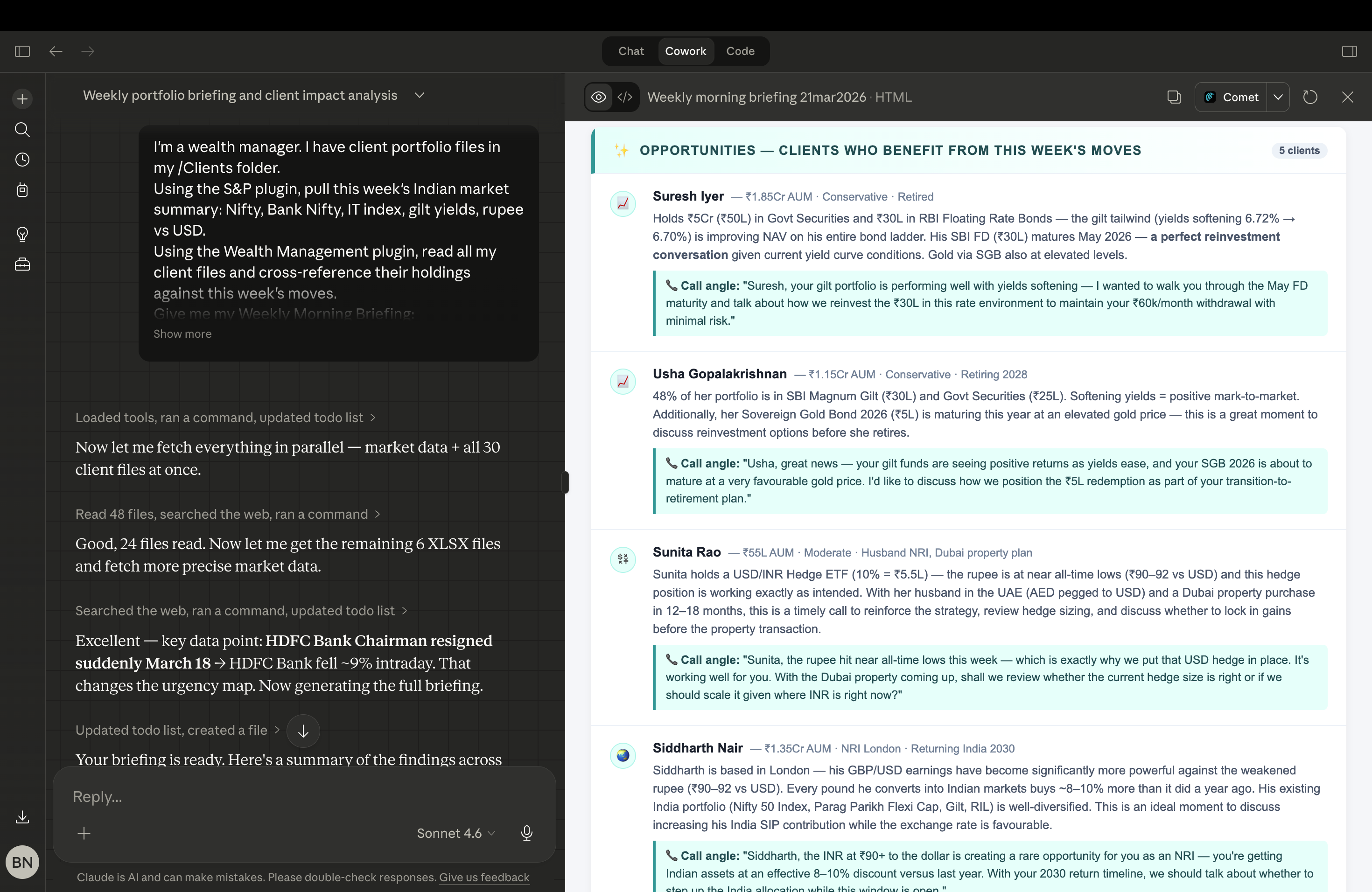 I opened Claude Cowork on a Monday morning with two plugins active: the Wealth Management plugin and the S&P Global plugin.