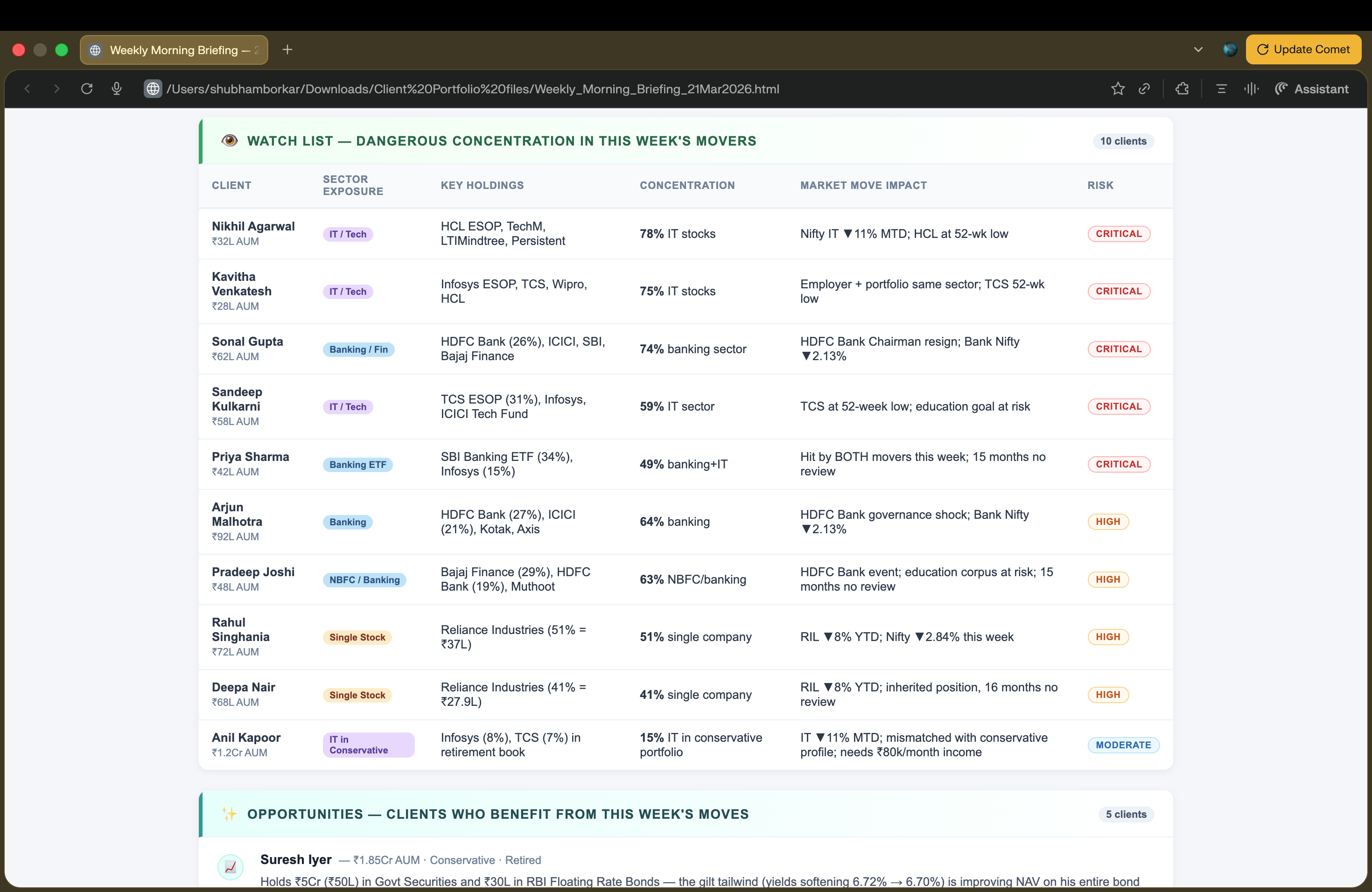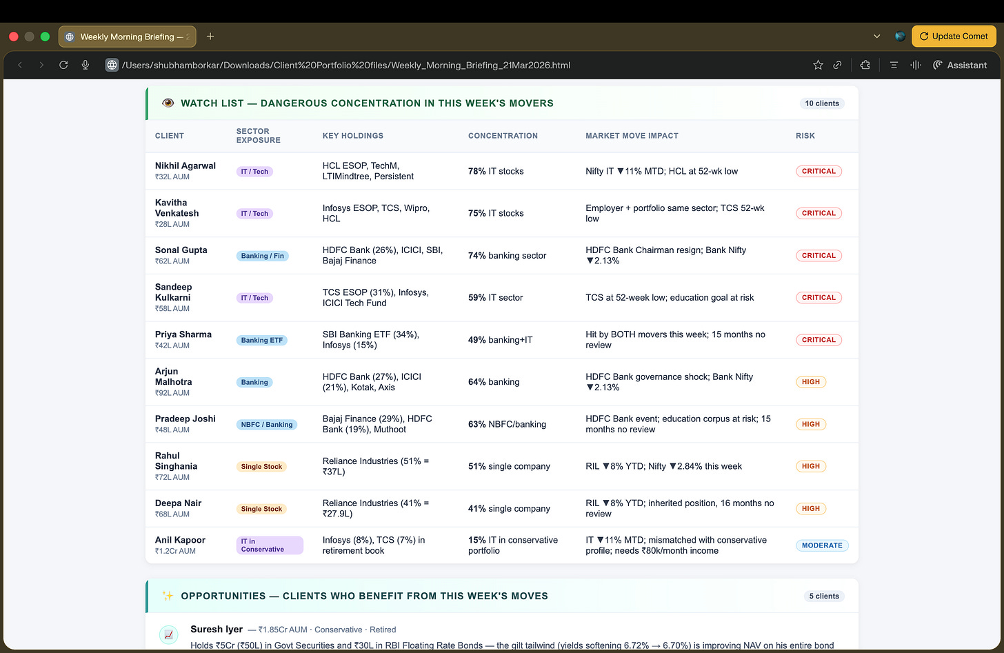 Most wealth advisors I talk to spend 2 to 3 hours on this. Pulling data. Cross-referencing watchlists. Checking who’s overdue for a review. Manually building a call priority list in their head, or worse, in a spreadsheet.
