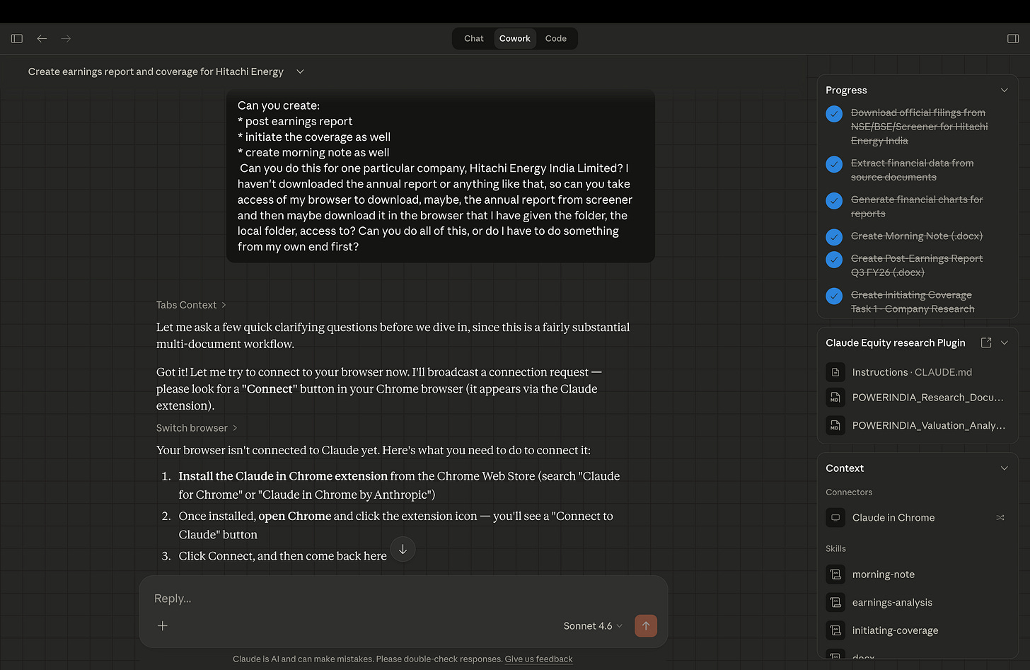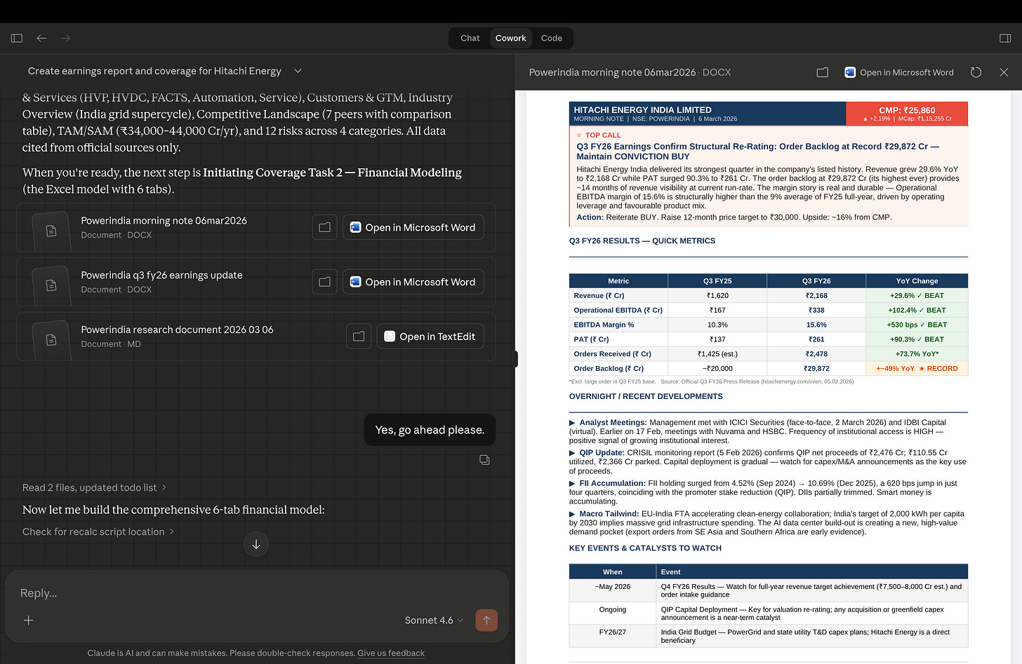 No prompt engineering. No special syntax. Just tell Claude what you want the same way you would brief a colleague. For this report, the instruction was simple: initiate coverage on Hitachi Energy India, build the financial model, run the valuation, write the investment thesis. That was it. One paragraph. Claude Cowork handled the rest.