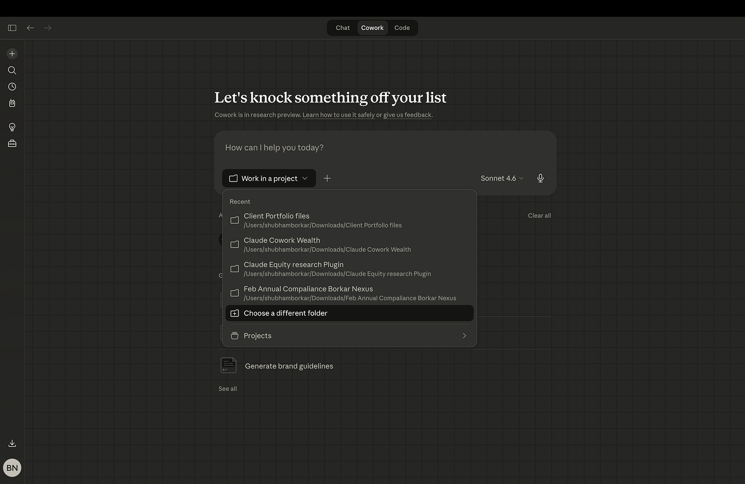 Open a folder on your desktop. This is where everything lives. Your source files, your firm’s report template, any compliance language you want included. Click the folder icon in Claude Cowork and point it to that folder. Whatever you put in there, Claude can read and use. That is the whole setup.