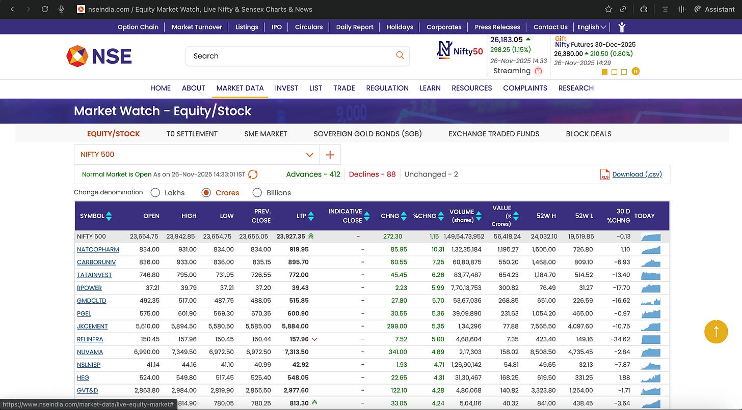 1. Go to NSE → Market Data → Equity & SME Market → Bhavcopy