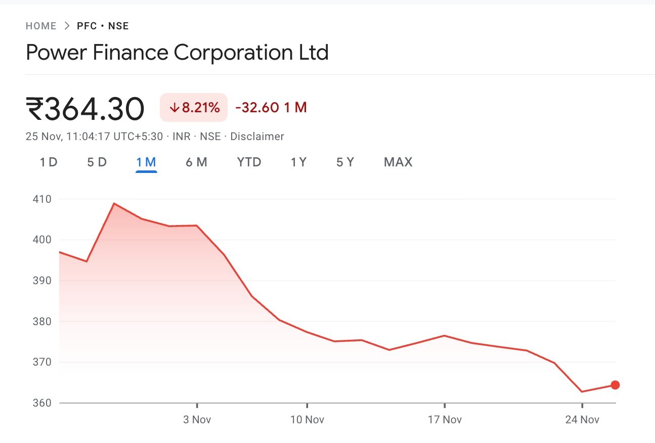 Power Finance Corporation Limited has dropped 8.2 percent in the past one month. If you are holding NBFCs focused on energy lending, you have felt this.