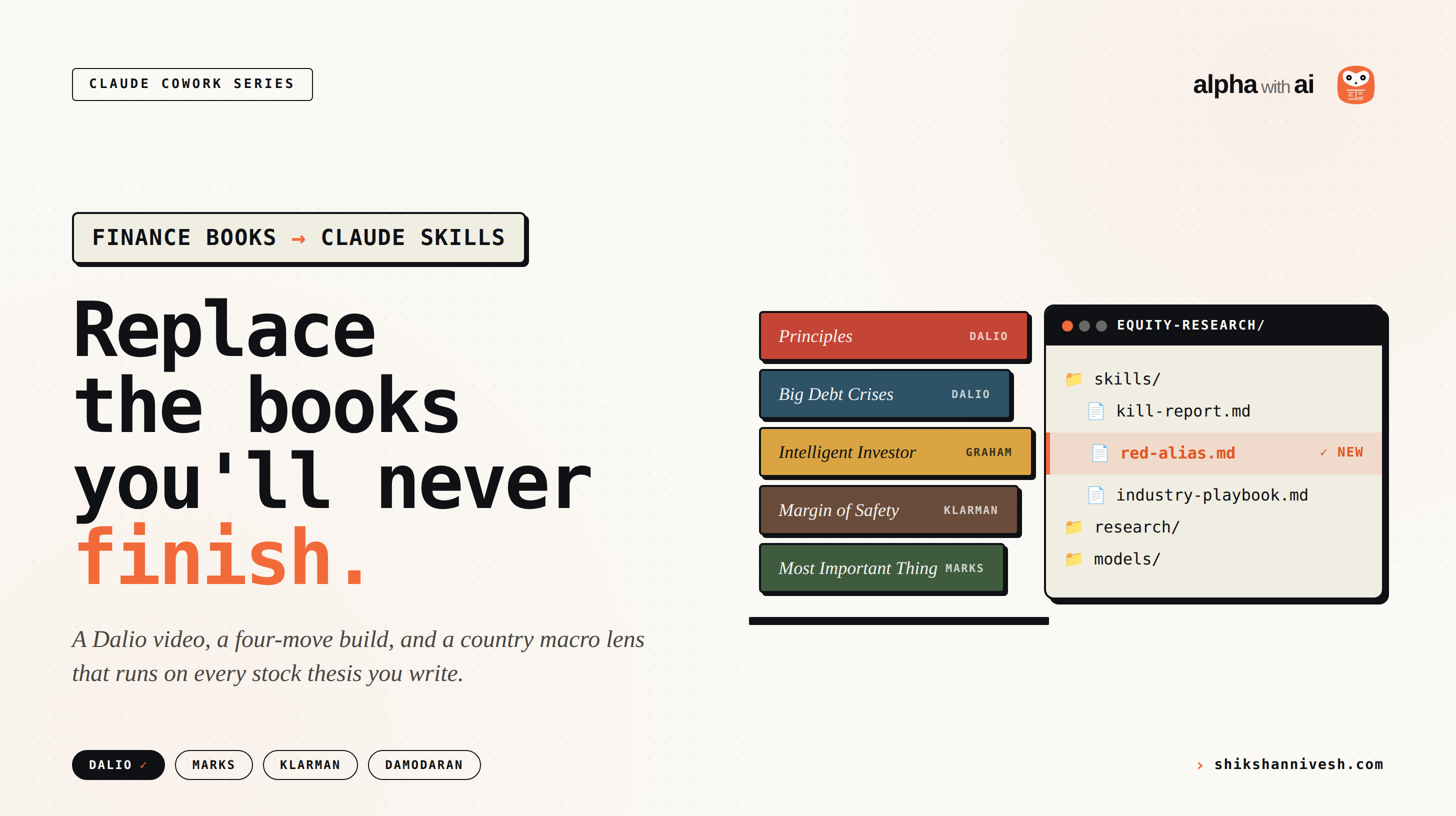 The thing underneath all of it is a way to take any author whose frameworks have been sitting on your shelf, whether it is Dalio, Marks, Damodaran, Klarman, Collins, or whoever, and bring their thinking into your workflow without ever finishing the book.