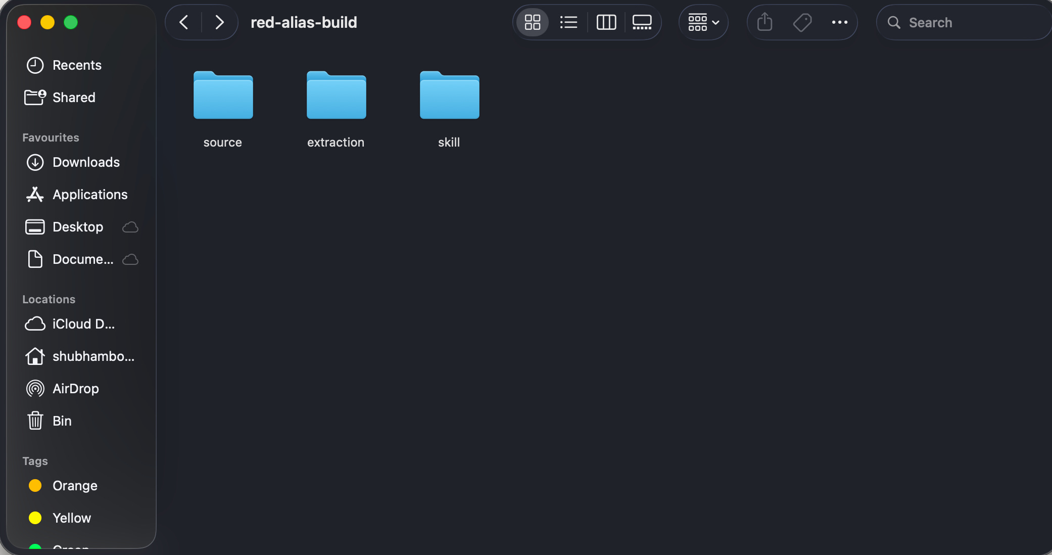 Now the execution. I made a folder on my Mac called red-alias-build. Inside it, three subfolders. One called source, one called extraction, one called skill. I saved the transcript as a plain text file inside source. Just a .txt or .md file, anything Cowork can read.