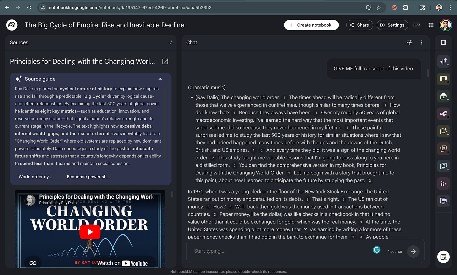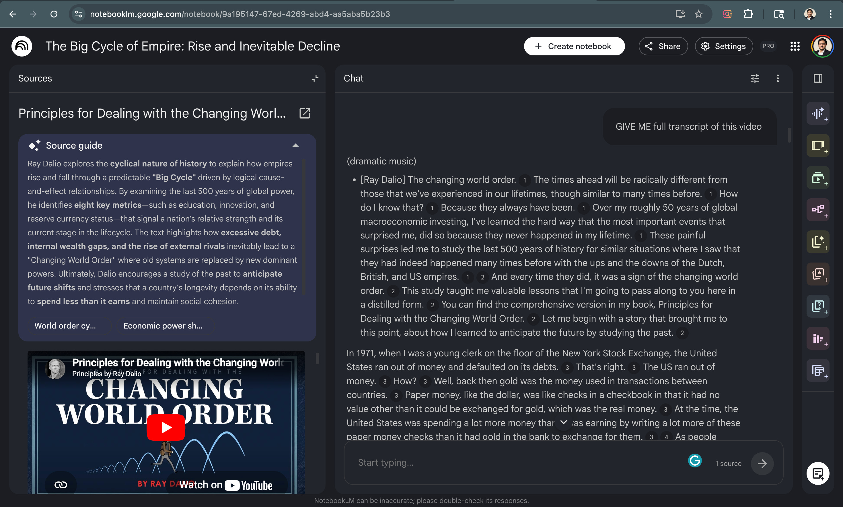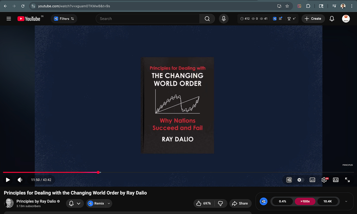 I opened YouTube. Dalio’s Big Cycle video, the 40 minute one from his Principles for Dealing with the Changing World Order book. Free. No login. No Kindle. No DRM headache.