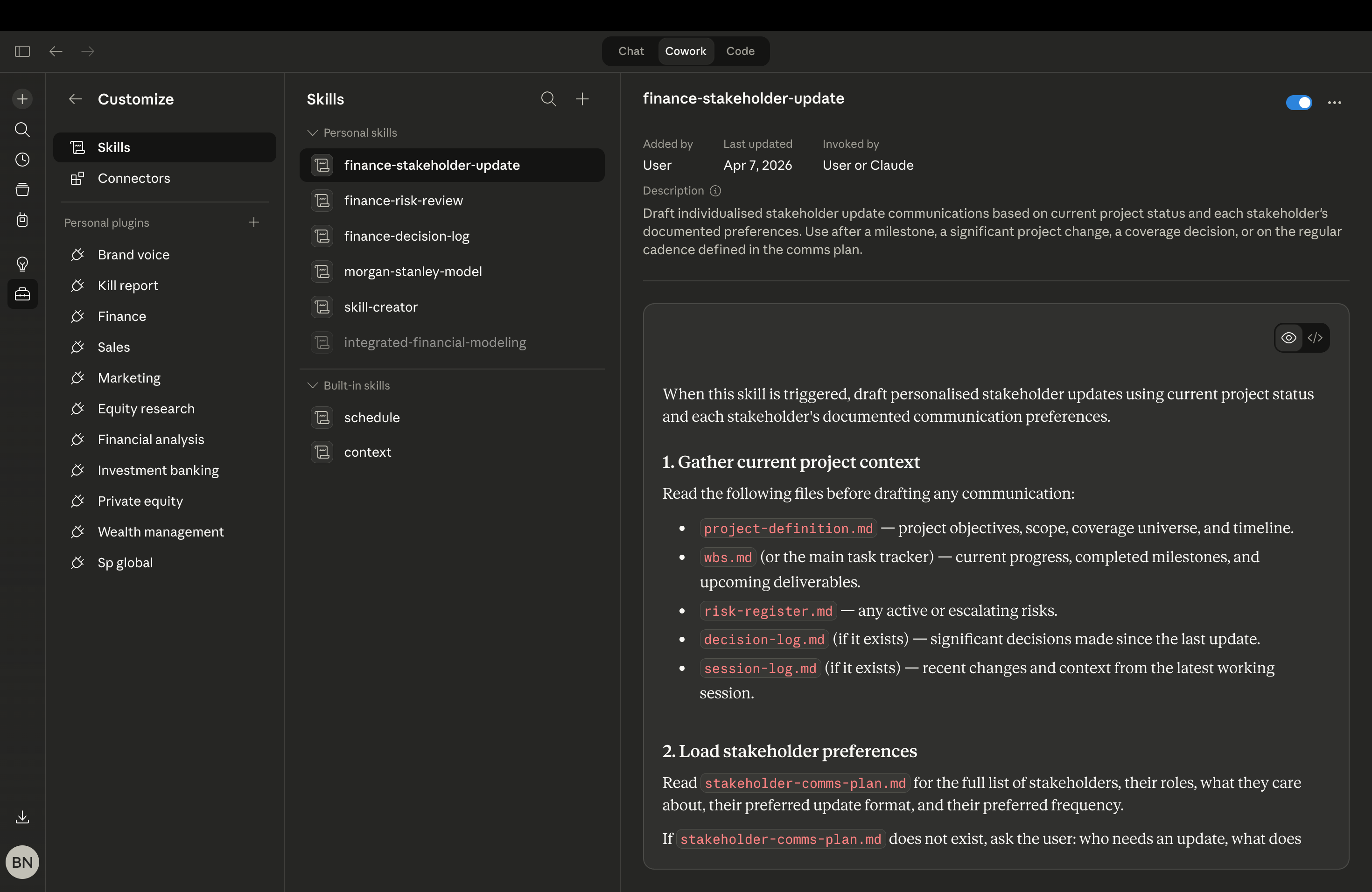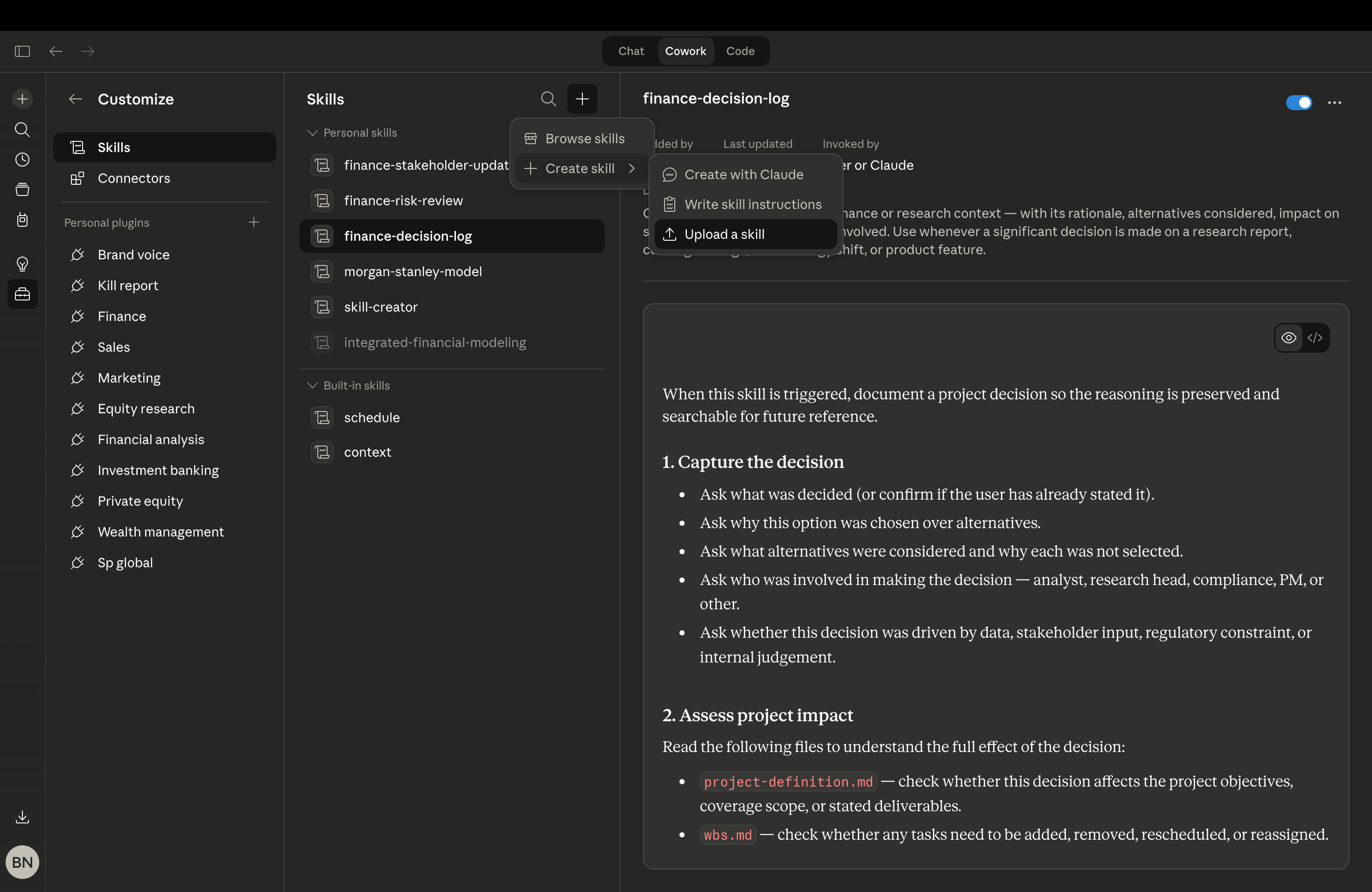 The decision log skill handles this. (download this skill from the download bundle at the end of this newsletter.) If you are on Claude Projects, add the contents of finance-decision-log-skill.md as a Project file. If you are on Claude Cowork, upload the file in a skills subsection inside your customize section, Claude loads it automatically.