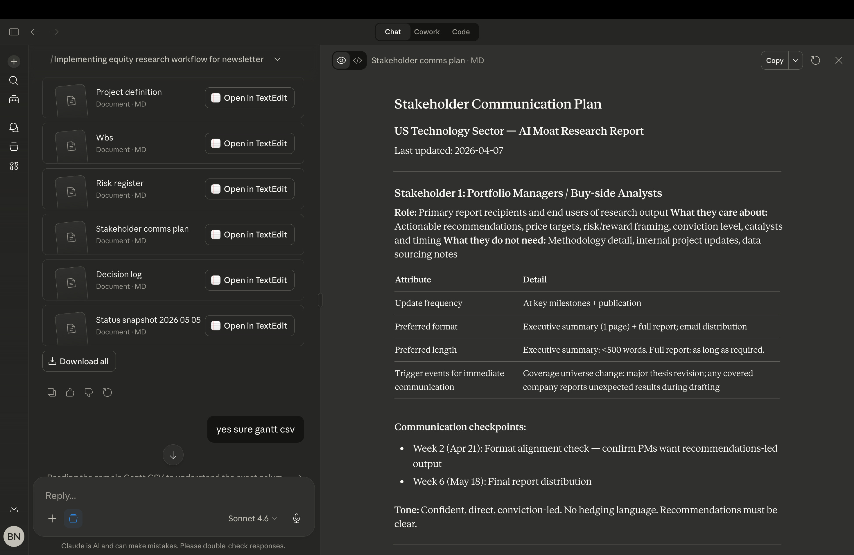 stakeholder-comms-plan.md. Present all drafts for review before sending.The Research Head gets 150 words on milestones and risks. The portfolio managers get recommendations and positioning updates. The junior analyst gets a task list for next week. Three different updates. Zero manual drafting.