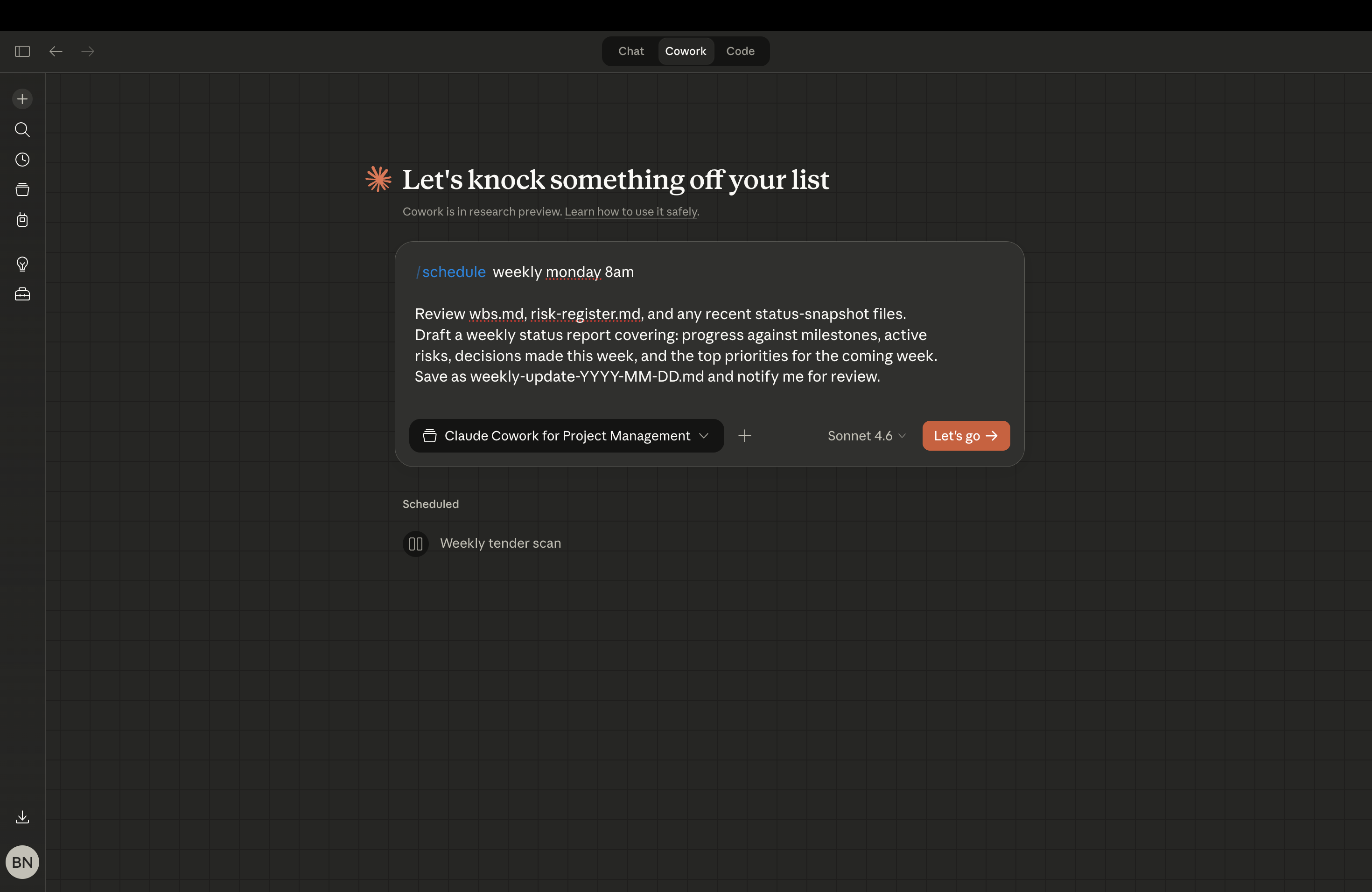Every Monday at 8am, Claude reads your WBS, your risk register, and any recent status snapshots. It drafts a full weekly report, progress against milestones, active risks, decisions made last week, and top priorities for the coming week. Saved as a file for your review before anyone else sees it.