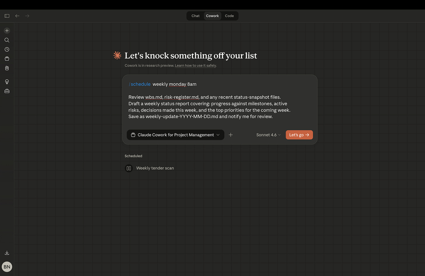 Claude Cowork has a scheduling feature. You set a task once, define when it runs, and it executes automatically, reading your project files, generating the output, and saving it for your review. No prompting. No remembering. No manual trigger.