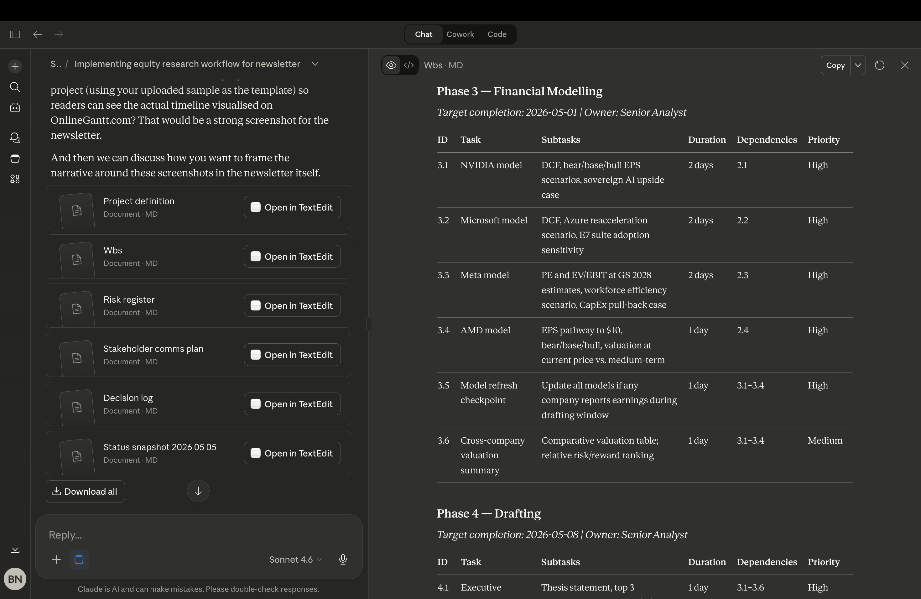 Using project-definition.md, generate a work breakdown structure for this research project. Decompose it into phases (data gathering, analysis, drafting, review, publication), tasks, and subtasks. For each task include: estimated duration, dependencies, responsible party, and priority level. Save as wbs.md.This gives you every task in the project, who owns it, how long it takes, and what it depends on. For a four-company sector report, expect 25 to 35 tasks across five phases.