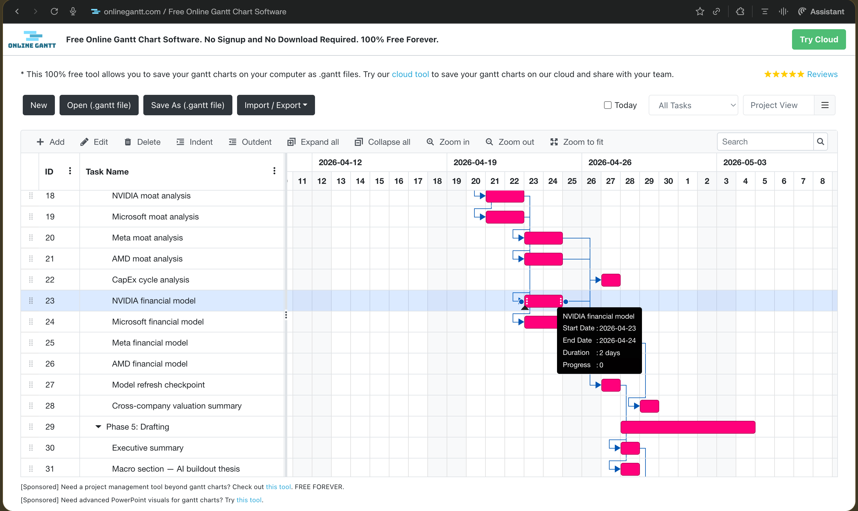 Generate a Gantt chart for this research project as a CSV file. Use this column format: Outline Level, ID, Name, Start, Finish, Duration, % Complete, Predecessors, Resource Names. Save as gantt-export.csv.Once the CSV is saved, upload it to OnlineGantt.com, free, no account required. You get a full colour-coded visual timeline with dependencies in under two minutes.